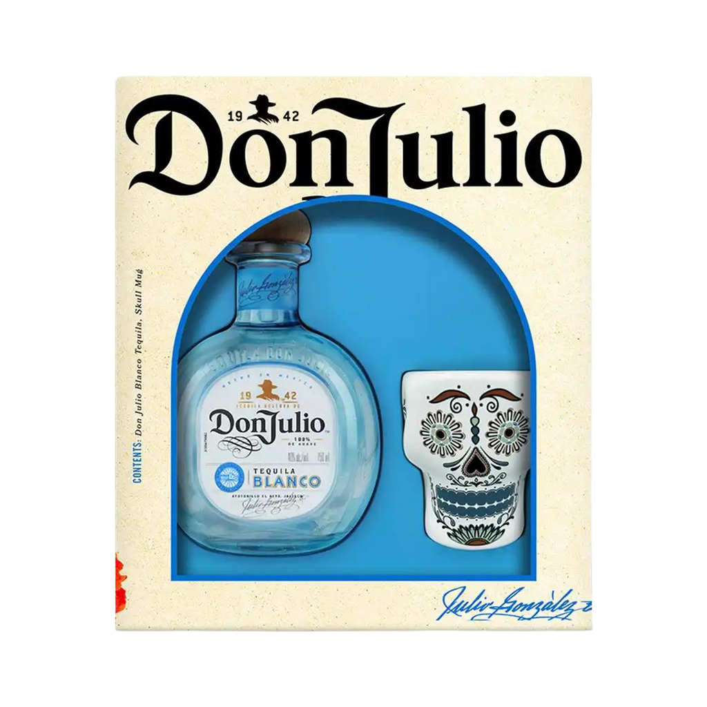 Don Julio Blanco VAP Gift Set is a premium tequila gift pack featuring Don Julio Blanco (Silver) Tequila paired with a skull-themed cup in a striking presentation box (as shown in the image: the iconic Don Julio Blanco bottle framed in blue beside a decorative skull cup). It’s a high-impact set for celebrations, gifting, and tequila lovers who appreciate clean agave purity and standout packaging.