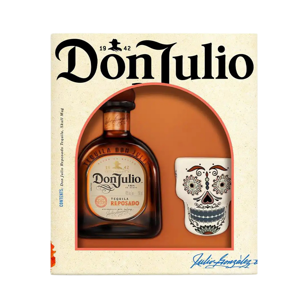 Don Julio Reposado VAP Gift Set is a premium tequila gift pack featuring Don Julio Reposado paired with a decorative skull cup, presented in a striking display box (as shown in the image: the Don Julio Reposado bottle set against a warm amber backdrop beside the skull cup). It is an ideal choice for celebrations, corporate gifting, and tequila enthusiasts who enjoy a smoother, barrel-aged style.