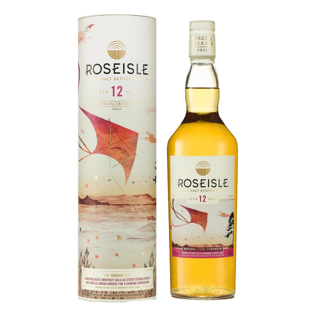 Introducing Roseisle 12 Year Old Special Releases 2023 Single Malt Scotch Whisky bottled at natural cask strength - The horizon dissolves into a rich palette of deep burgundy and shades of dark plum. Against this swirling backdrop of stunning colours, an elegant kite twists and turns in its magical way. Built on centuries of a craft that pairs wonder and simplicity, these immaculate folds of delicate paper ride the wind towards the clouds. Paper, wood, string, and a touch of alchemy send the kite maker’s creation soaring. At Roseisle Distillery, whisky making is a masterful merging of simple elements to create a stunning single malt that soars with profound flavours. Notes of sweet vanilla smoothly sail through this lofty expression, from which rise deep, luscious flavour notes of rich, sticky stewed fruits. Mellow, with some prickle, the aroma is lush. Rich in promise, with light hints of vanilla, yet also complex and tightly integrated. The sweet vanilla aroma increases; beneath lie notes of ripe fruit and white chocolate. Smoothly creamy in texture, the taste is rich and sweet, with rising notes of fruit and spiciness that bring a balancing warm complexity to lift the taste toward the rich, long finish.