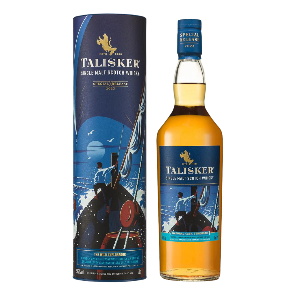 Introducing Talisker Special Release 2023 Single Malt Scotch Whisky bottled at natural cask strength - A surge of warmth rises through the current, radiating a sweet, charred undertone. The crash of sea-salt spray against the ship’s bow relights the fire of exploration in determined sailors. Against an unforgiving sea the caravel, an iconic Portuguese sea vessel, forges on, braving harsh elements to reach the farthest corners of the earth. Our Malt Master pays homage to the Portuguese origins of these great seafarer’s ships, by finishing this supreme maritime whisky in a combination of Ruby, White and Tawny port casks. Reigniting our own passion for exploration, this unusual combination of casks brings uncanny balance to a tumultuous Talisker. Rich bright gold lights the fires of desire, while clear maritime notes of sea air carry hints of oyster shell, salt and sand dune on a spicy and peaty base. Surging through them come rich, sweet hints of white grape, dark fruit and dry tannin. In the mouth, these characters merge as one creamy-smooth richly fruity taste, with waves of saltiness, smoke and spice crashing through the intense finish.